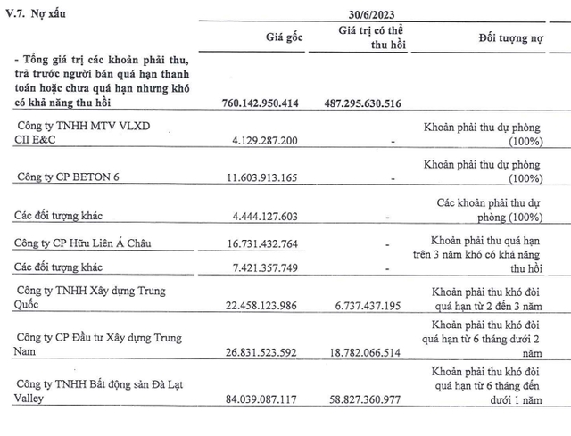 Dự phòng phải thu khách hàng đến ngày 30/9/2023 đã được trích lập 273 tỷ đồng. Trong đó, các khoản trích lập lớn nhất là BĐS Đà Lạt Valley (25 tỷ đồng) và Công ty TNHH Delta Valley Bình Thuận (77,6 tỷ).
