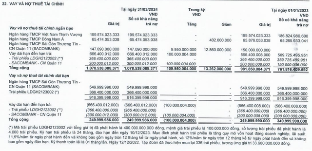 Đầu tư LDG thuyết minh các khoản vay chủ yếu 447 tỷ đồng tại Ngân hàng Sacombank – Chi nhánh Quận 11; 199,57 tỷ đồng tại Ngân hàng TMCP Việt Nam Thịnh Vượng; 65,47 tỷ đồng tại Ngân hàng TMCP Đông Nam Á …