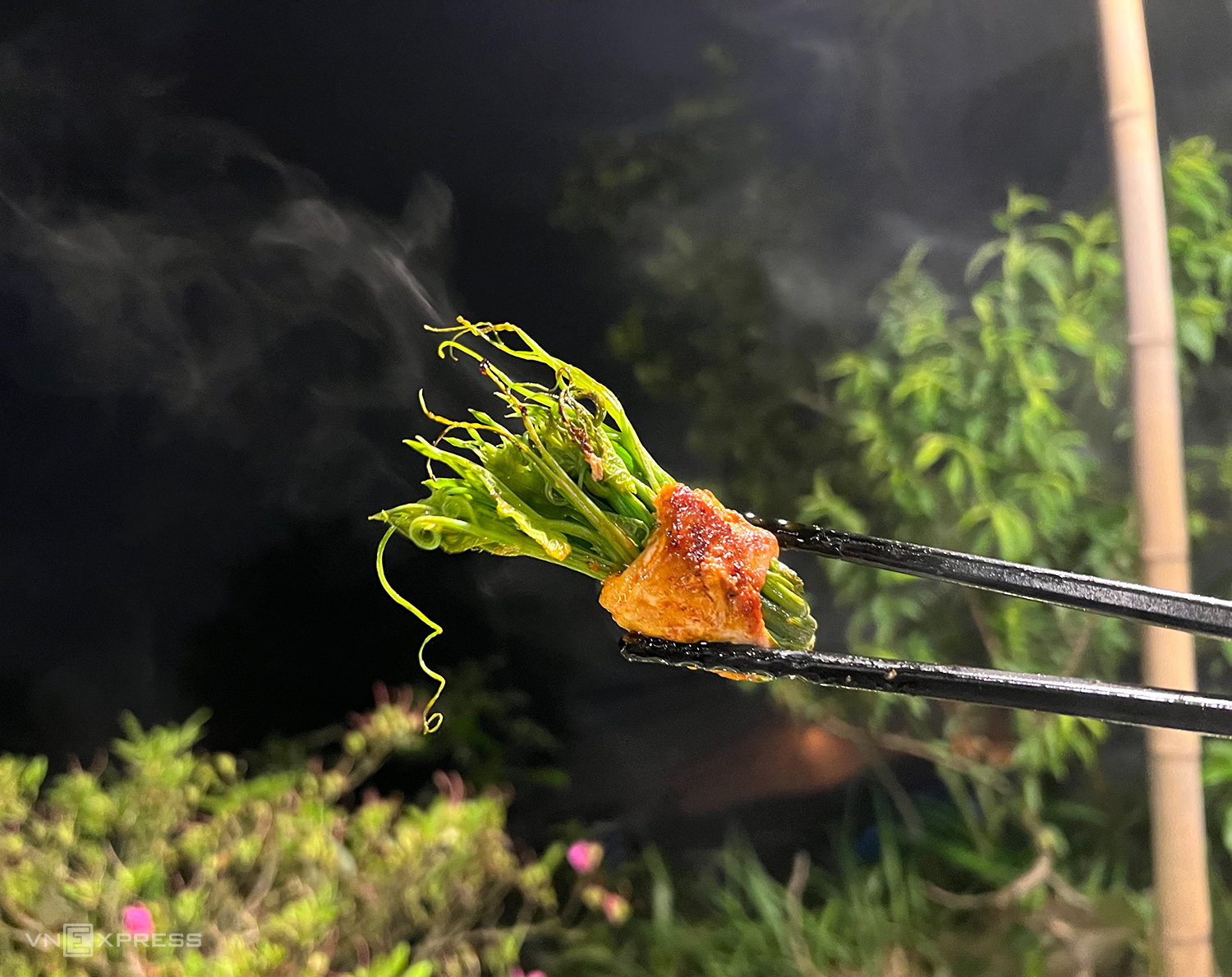Nếu chọn đồ nướng BBQ khi ăn tối tại Tam Đảo, bạn vẫn được phục vụ món thịt cuốn su su. Thịt được tẩm ướp thơm lừng, cuốn với su su giòn sần sật, ăn đầm miệng. Bạn có thể mua ngọn su su để mang về làm quà.