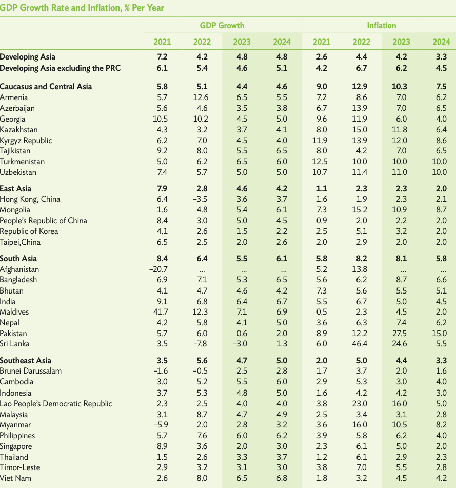 Ngân hàng Phát triển châu Á (ADB) dự báo, kinh tế Việt Nam được kỳ vọng đạt mức tăng trưởng 6,0% trong năm 2024 và 6,2% trong năm 2025. Con số này cao hơn mức tăng trưởng của Trung Quốc khi quốc gia này được dự báo đạt mức tăng trưởng GDP 4,8% trong năm 2024, thấp hơn mục tiêu “khoảng 5%”. Còn ADB kỳ vọng tăng trưởng Ấn Độ sẽ cao nhất trong khu vực, ở mức 7% trong năm 2024 và 7,2% vào năm 2025.