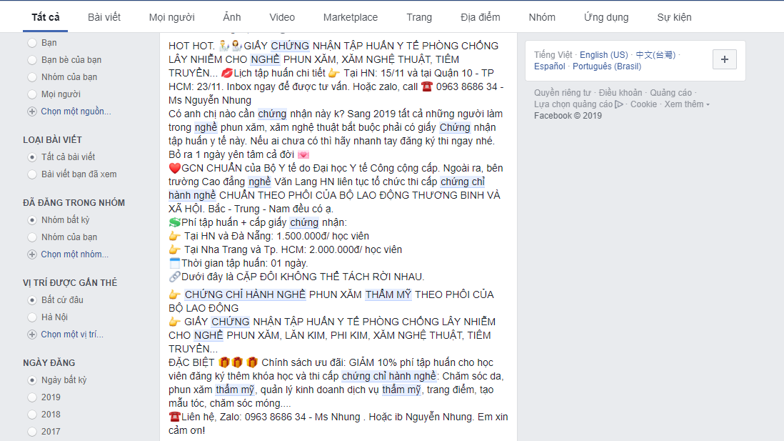 Để tỏ ra nguy hiểm hơn, có trang facebook còn tung tin đồn hòng đánh trúng tâm lý của những đối tượng có nhu cầu mua chứng chỉ như: “Sang năm 2019, tất cả những người làm trong nghề phun xăm, xăm nghệ thuật bắt buộc phải có giấy chứng nhận tập huấn y tế này. Nếu ai chưa có thì hãy nhanh tay đăng ký nhé. Bỏ ra một ngày yên tâm cả đời.”