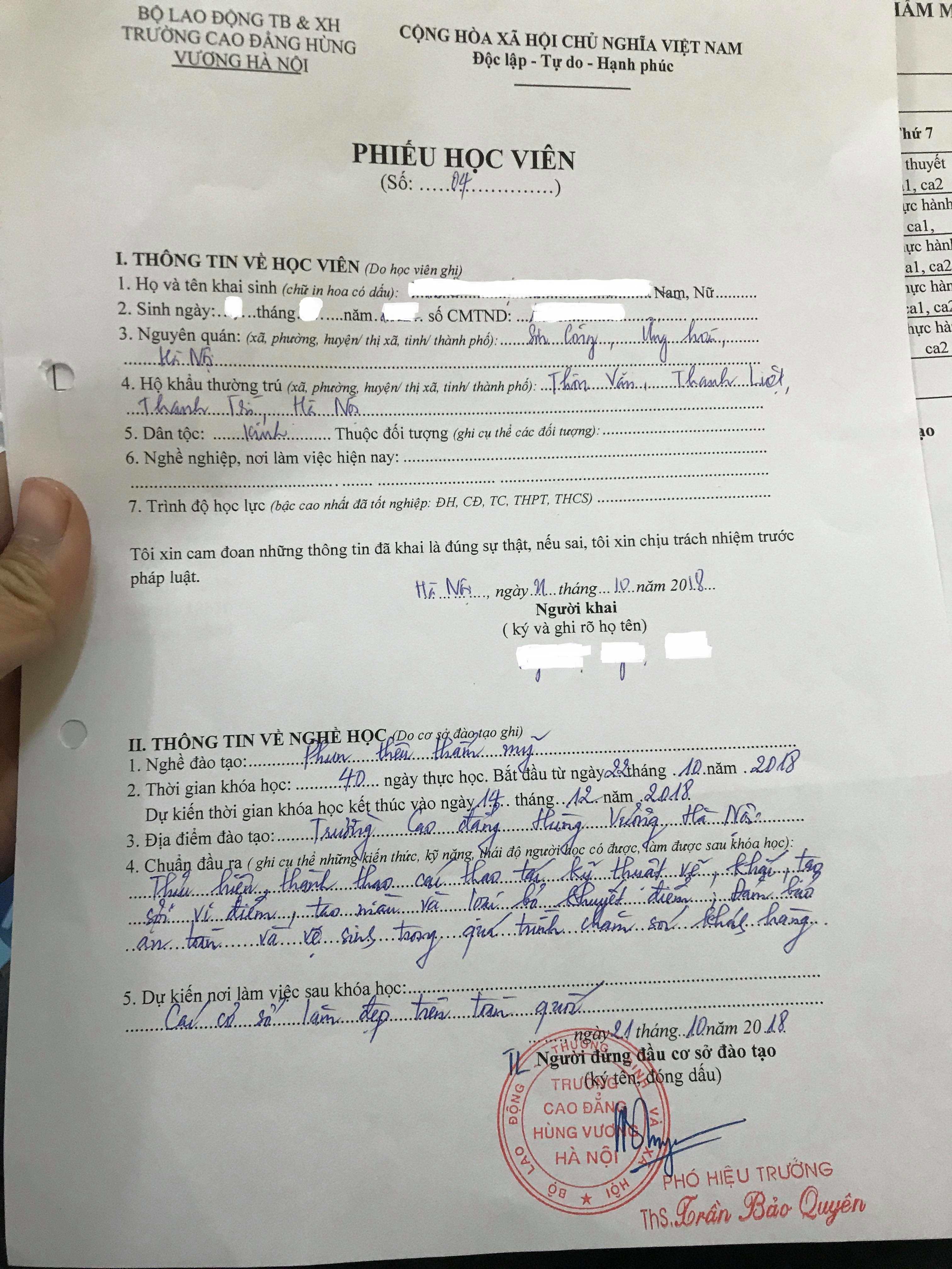 Theo như bà Mai Anh: Khoảng 9 giờ sáng ngày 10 -12 -2018, có người gọi cho tôi bảo chỗ người quen gọi đến để đi học lớp phun thêu thẩm mỹ, do không có ở trường nên tôi đã nhờ bạn Tạ Thu Hương cán bộ tuyển sinh của trường đưa học viên vào lớp cô Hoa. Mấy ngày sau, tôi có hỏi hồ sơ của bạn ấy đâu để nộp thì chị họ tôi có nói sẽ cho người mang đến, sau đó lại chuyển qua zalo. Vì chuyển qua zalo nên tôi đã phải đi in ảnh, vì thế tôi đã nộp qua phòng đào tạo sau khi đã kết thúc khoá học”.