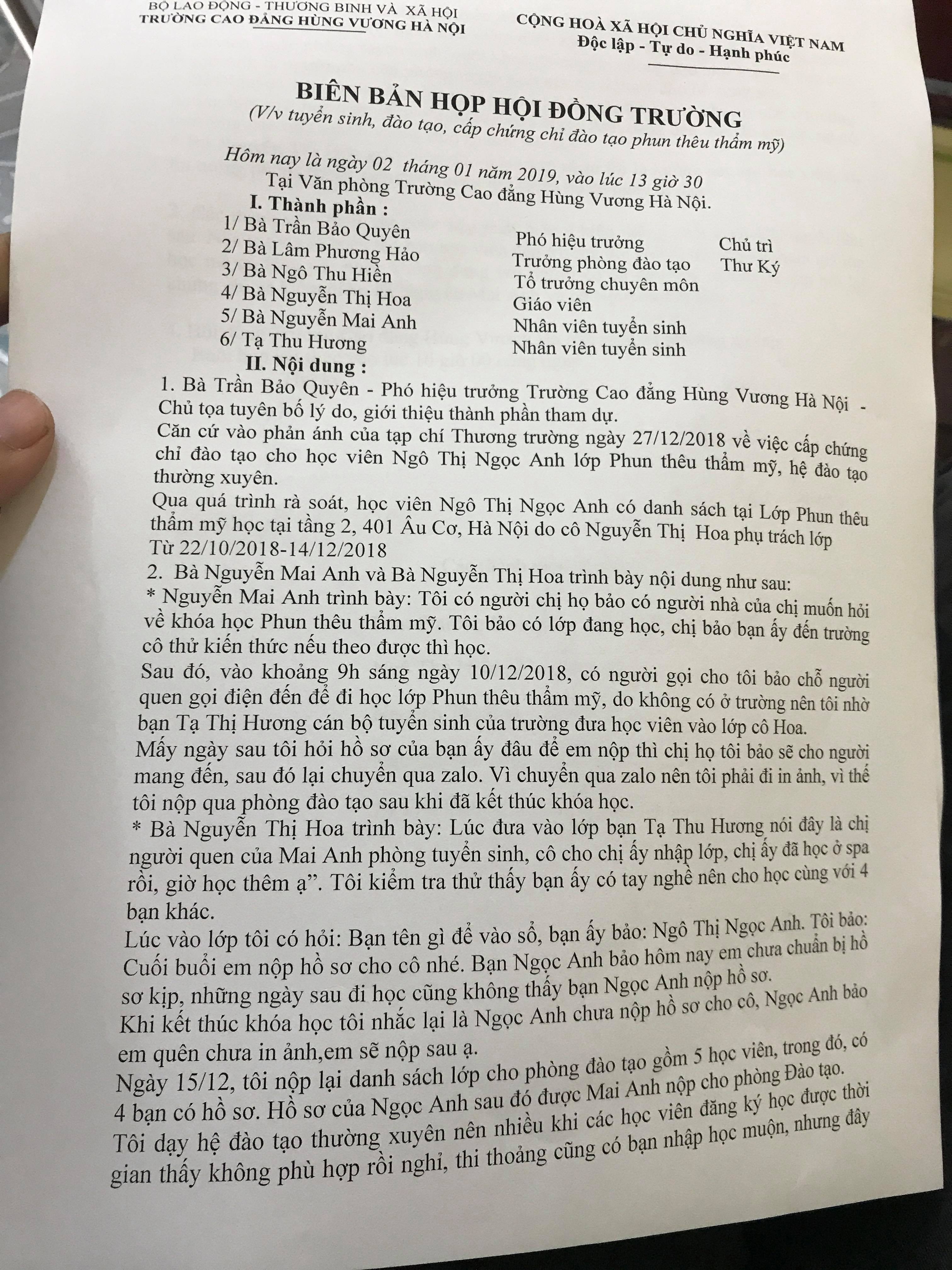 Ngày 02/01/2019, Ban giám hiệu trường Cao đẳng Hùng Vương đã tổ chức buổi họp hội đồng, các thành viên tham gia gồm có bà Trần Bảo Quyên (Phó hiệu trưởng), bà Lâm Phương Hảo (Trưởng phòng đào tạo), bà Ngô Thu Hiền (Tổ trưởng chuyên môn), cùng bà Nguyễn Thị Hoa (Giáo viên) và Tạ Thu Hương, Nguyễn Mai Anh là nhân viên tuyển sinh. Tại biên bản “Họp hội đồng trường” ghi rõ ngày 10/12/2018 tức là chỉ sau 4 ngày kết thúc khóa học, học viên N.A. đề xuất xin học lớp “Phun thêu thẩm mỹ” và được dễ dàng chấp thuận với lý do là “người quen”.