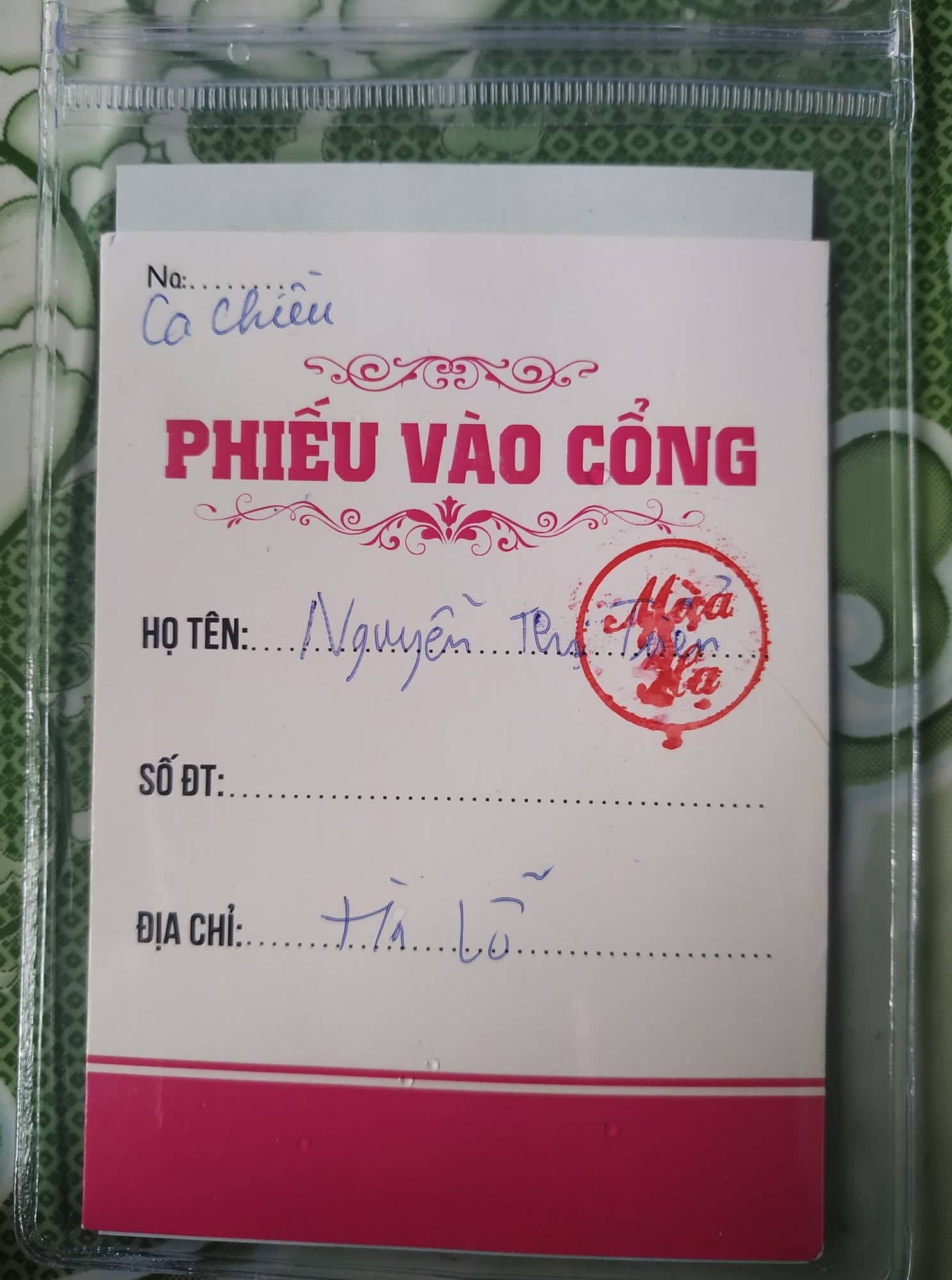 Thẻ ra vào có ghi rõ ca tham dự và phân đội quản lý trong chương trình Cứ như thế, mỗi ngày 2 buổi chương trình được tổ chức, vẫn những chiêu trò cũ, vẫn sản phẩm hồng sâm đó, giá bán thì đắt gấp nhiều lần ngoài thị trường nhưng buổi nhiều thì hơn chục người mua, ít cũng năm, bảy người, công ty thu lại vài chục đến hàng trăm triệu đồng mỗi buổi.