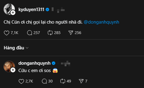 Đồng Ánh Quỳnh cũng nhanh chóng đáp trả khi bị Kỳ Duyên nhắc tên: "Cứu chị em ơi SOS."