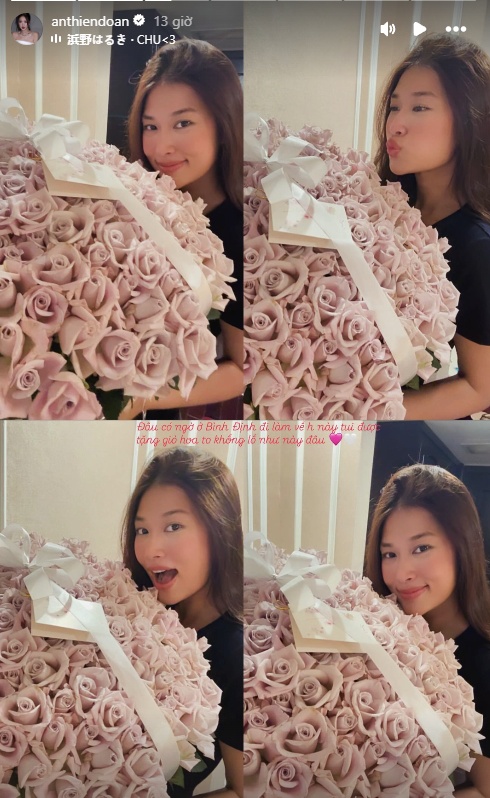 Đáng chú ý, phía hoa hậu Đoàn Thiên Ân cũng lập tức có động thái trên trang cá nhân. Nàng hậu cũng khoe bó hoa hồng được "ai đó" tặng kèm dòng trạng thái: "Đâu có ngờ ở Bình Định đi làm về giờ này tui được tặng giỏ hoa to khổng lồ như này đâu" kèm icon hai hình trái tim.