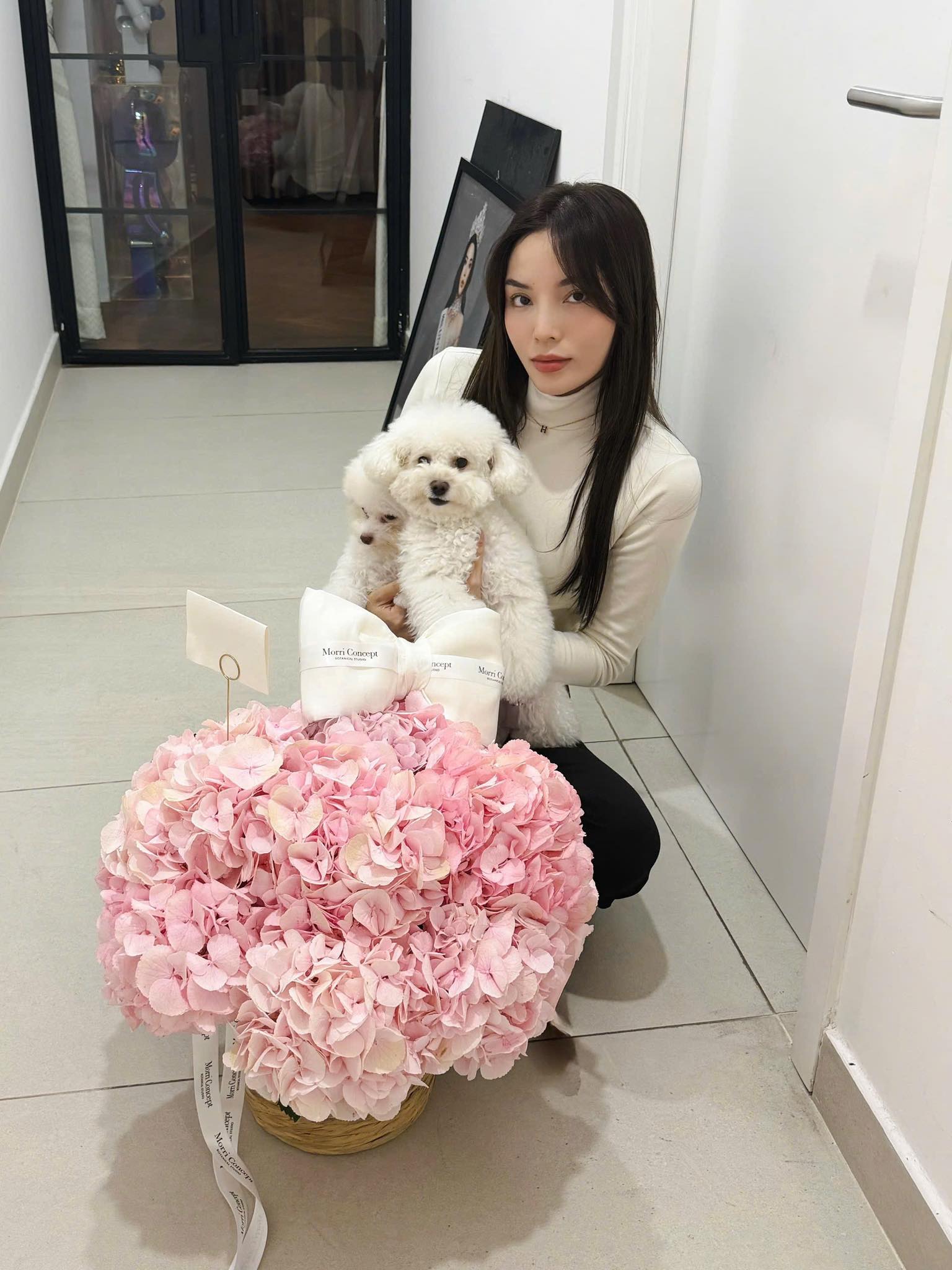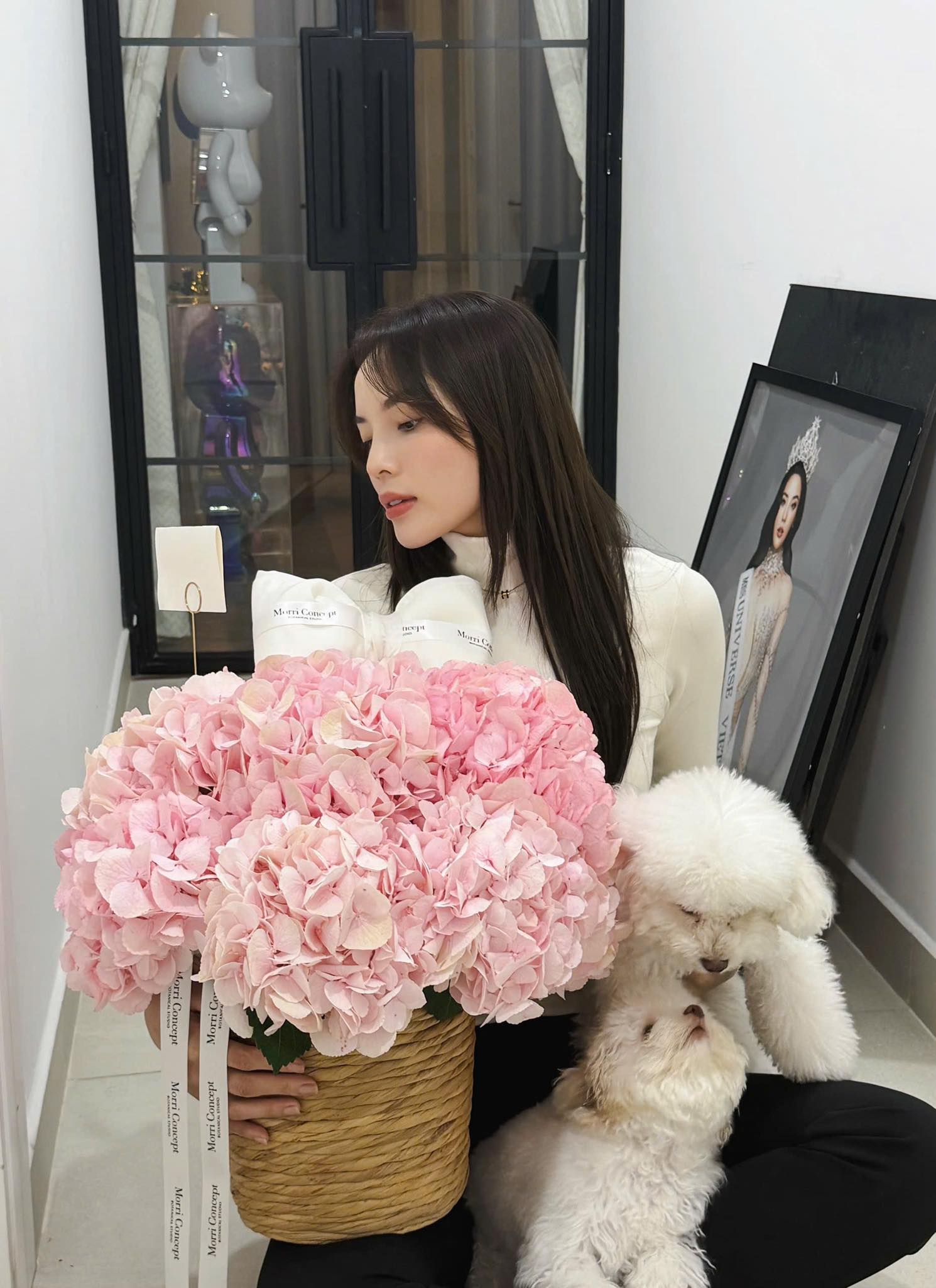 Hoa hậu Kỳ Duyên và Thiên Ân đều khoe bó hoa màu hồng đặc biệt nhân ngày phụ nữ Việt Nam.