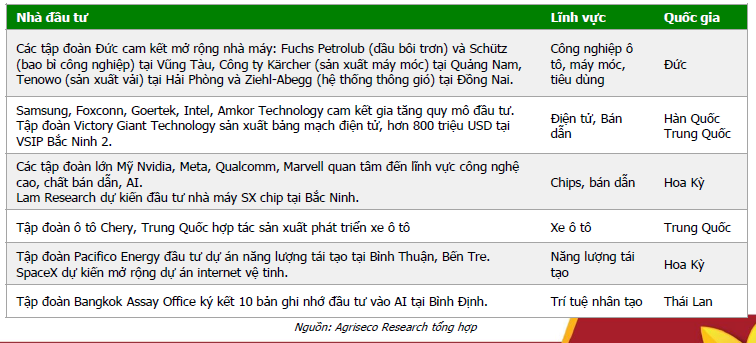 Nhiều tập đoàn lớn tiếp tục mở rộng đầu tư/cam kết mở rộng đầu tư: Các đối tác lớn truyền thống của Việt Nam như Samsung, LG, Foxconn, Amkor đều dự kiến mở rộng hoạt động sản xuất tại Việt Nam trong thời gian tới, tập trung ở lĩnh vực bán dẫn, AI, điện tử. Các tập đoàn lớn từ Mỹ (Intel, Nvidia) cũng cam kết đầu tư các lĩnh vực AI, chất bán dẫn.
