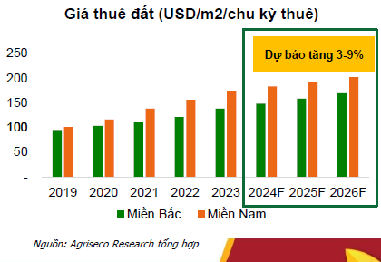 Bên cạnh đó, theo CBRE, giá thuê khu vực miền Bắc dự báo tăng trưởng 5-9%, miền Nam ước tăng 3-7% giai đoạn 2024-2026 sẽ tác động tích cực cho CĐT cho thuê KCN. Giá cho thuê đất KCN dự kiến duy trì đà tăng do nhu cầu thuê lớn. Hiện tại, mặt bằng giá thuê KCN ở Việt Nam vẫn thấp hơn 15-20% so với các quốc gia trong khu vực (Indonesia, Malaysia,v.v) tạo thuận lợi thu hút dòng vốn đầu tư.