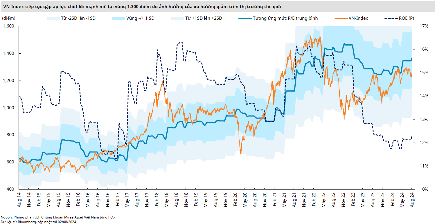 Mirae Asset cho rằng diễn biến giao dịch ở những phiên đầu tiên của tháng 8 đang phản ánh sự e ngại rủi ro của nhà đầu tư, đặc biệt là nhóm nhà đầu tư cá nhân trong nước. Dù vậy, rủi ro giảm điểm vẫn còn hiện hữu khi áp lực giảm điểm chung trên các nền thị trường chứng khoán lớn sẽ góp phần tác động tiêu cực đến diễn biến giao dịch tại thị trường Việt Nam.