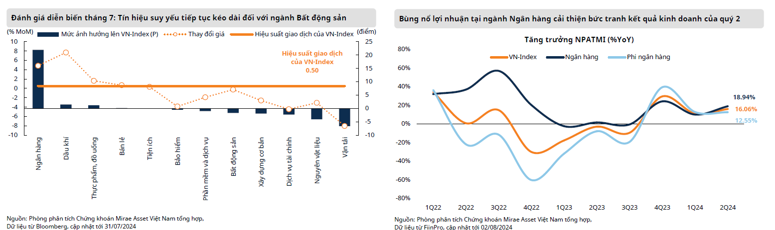 Dù thị trường chung vẫn chưa có sự thay đổi đáng kể trong tháng 7 với mức tăng 0,5% của VN-Index, tâm lý giao dịch tiếp tục chịu sức ép đáng kể khi chịu ảnh hưởng bởi các tin tức vĩ mô thế giới với giá trị giao dịch (GTGD) khớp lệnh bình quân giảm 23% MoM dù bức tranh lợi nhuận quý 2 đã khép lại với những con số tăng trưởng ấn tượng.