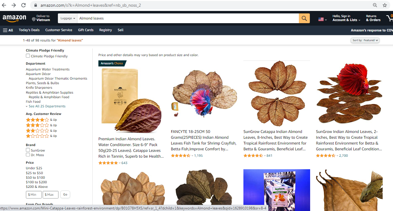 Lá bàng khô xuất hiện trên một trong các trang thương mại điện tử lớn nhất trên thế giới.