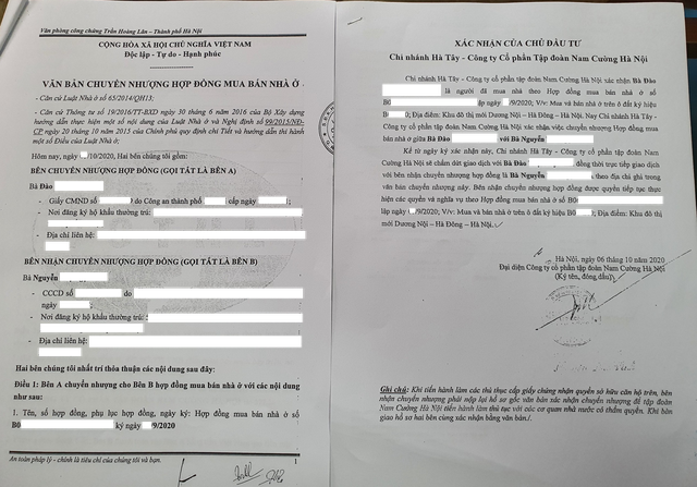 Mở một bản hợp đồng đã ký kết với khách mua trước đó, chị T giải thích, việc ký hợp đồng được chủ đầu tư chỉ định 1 cá nhân nội bộ để ký hợp đồng mua bán. Sau đó, họ sẽ chuyển nhượng cho khách có nhu cầu mua theo một hợp đồng dưới dạng "Văn bản chuyển nhượng hợp đồng mua bán nhà ở".