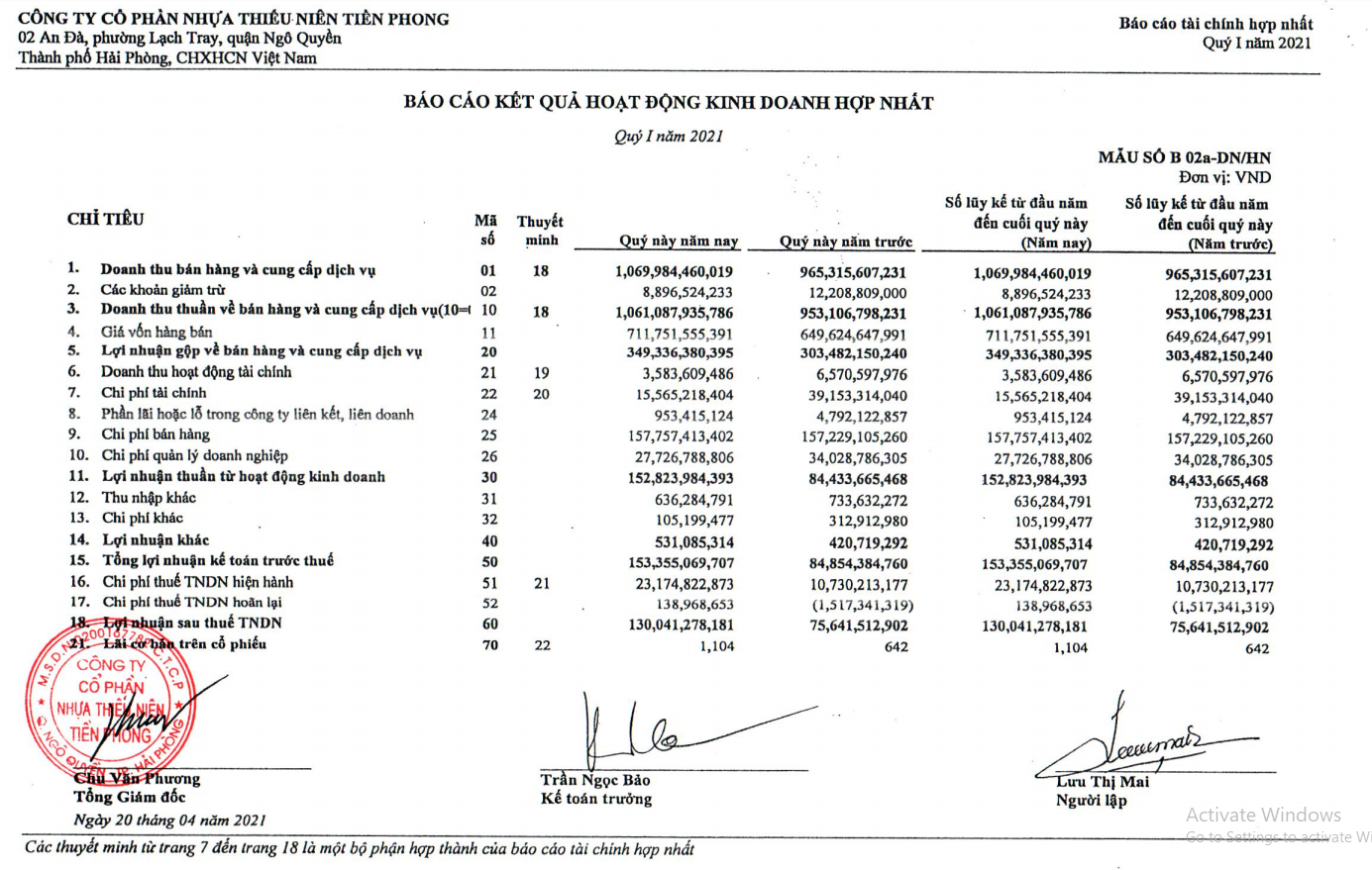 Nguồn: BCTC quý I/2021 của Nhựa Tiền Phong.