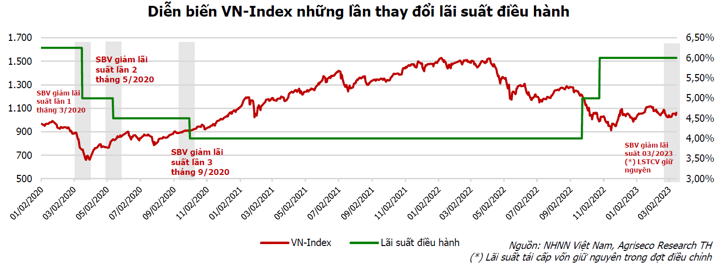 Agriseco Research đánh giá động thái NHNN giảm lãi suất là tín hiệu tích cực báo hiệu việc dừng thắt chặt tiền tệ. Từ giờ đến cuối năm dư địa giảm lãi suất vẫn còn khi mặt bằng lãi suất tỷ giá lạm phát đang ổn định nhưng không lớn do FED vẫn tiếp tục lộ trình tăng lãi suất và giữ lãi suất cao đến cuối năm. Lãi suất điều hành giảm kỳ vọng thúc đẩy các NHTM chủ động giảm lãi suất huy động từ đó hạ lãi suất cho vay giảm thiểu chi phí đầu vào cho doanh nghiệp hộ gia đình thúc đẩy các hoạt động sản xuất kinh doanh.