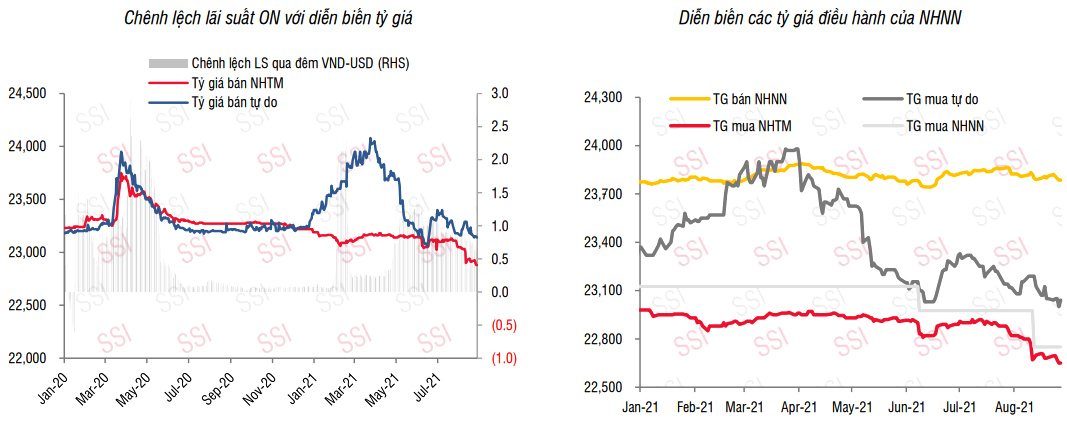 Theo số liệu từ SSI Research, tính đến thời điểm hiện tại, VND đã tăng giá tới 1,4% so với cuối năm 2020 và là một trong những đồng tiền có diễn biến tốt nhất trong khu vực. Cán cân hàng hóa nhập siêu đã được hỗ trợ bởi dòng vốn FDI giải ngân và kiều hối, giúp tỷ giá duy trì mức thấp như hiện nay. Tuy nhiên, áp lực lên cán cân thanh toán tổng thể đã tăng dần khi số liệu về cán cân thương mại hàng hóa và giải ngân FDI trong tháng 8 không mấy tích cực.