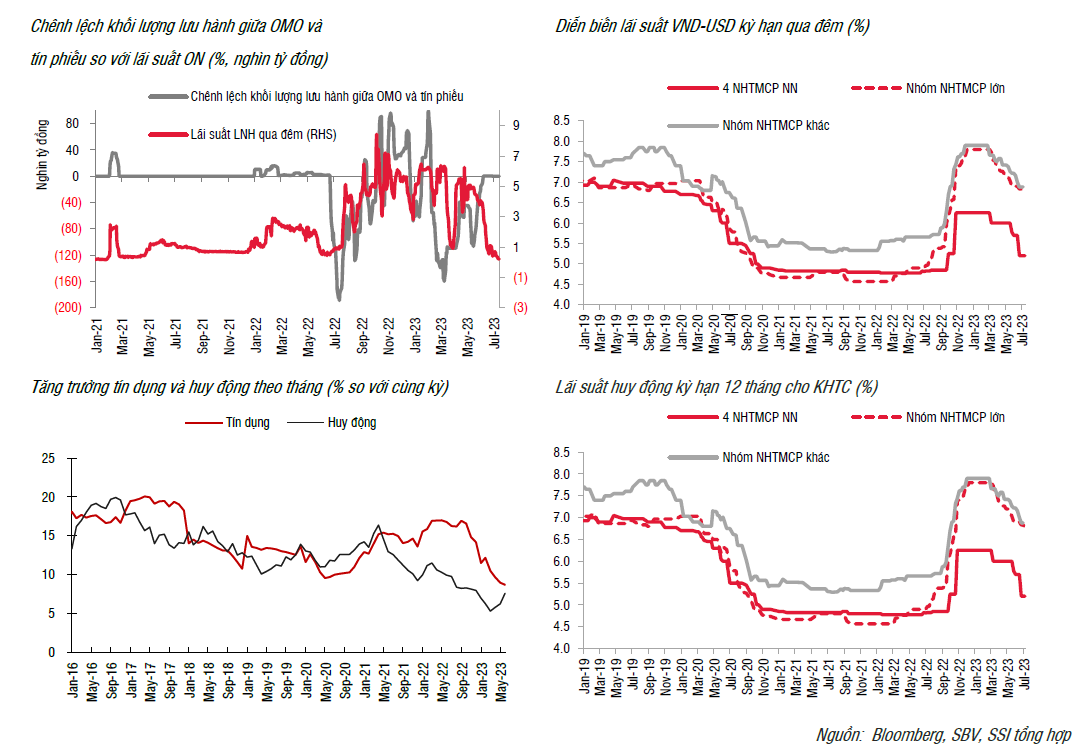 Trong báo cáo Bản tin thị trường tiền tệ, trái phiếu tuần 10/07/2023 – 14/07/2023 mới cập nhật, SSI Research cho biết thanh khoản trên hệ thống ngân hàng ổn định và hoạt động trên kênh thị trường mở trầm lắng. Cụ thể, NHNN chỉ chào thầu 15 nghìn tỷ trên kênh kỳ hạn 7 ngày và không có khối lượng trúng thầu nào được ghi nhận.