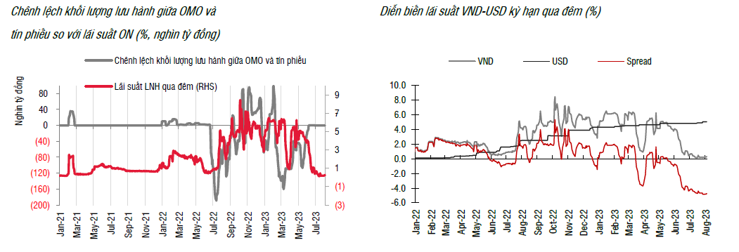 Tuần 31/07-04/08/2023, lãi suất liên ngân hàng kỳ hạn qua đêm dao động trong biên độ hẹp (0,2%) và chênh lệch với lãi suất USD duy trì ở mức -500 điểm cơ bản.