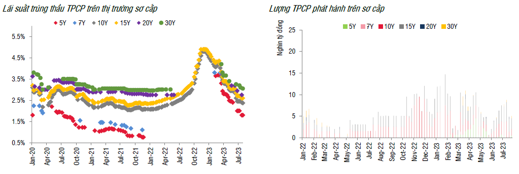 Tuần trước, KBNN đăng ký gọi thầu 5 nghìn tỷ đồng, ở các kỳ hạn 5, 10, 15 và 20 năm và toàn bô khối lượng trúng thầu. Lợi suất trúng thầu tiếp tục xu hướng giảm, trong đó kỳ hạn 10 và 30 năm giảm 3-5 điểm cơ bản so với phiên trúng thầu trước đó và kỳ hạn 5 và 15 năm không thay đổi.