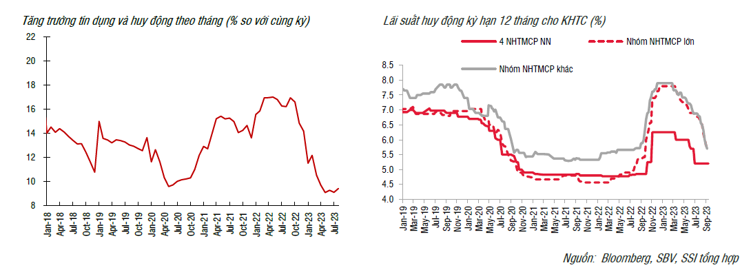 Trong tuần qua, 3 NHTMCPNN (BIDV, Vietcombank và Agribank) đã thông báo điều chỉnh giảm lãi suất huy động với mức giảm 10-30 điểm cơ bản ở các kỳ hạn từ 6 tháng trở lên. Một số NHTMCP cũng đồng loạt điều chỉnh 10-50 điểm cơ bản, chủ yếu ở kỳ hạn trên 6 tháng và tính đến hiện tại, lãi suất niêm yết dành cho KHTC cho kỳ hạn 12 tháng tại nhóm NHTMCPNN là 4,9%, 5,4% cho nhóm NHTMCP lớn và 5,7% cho nhóm NHTMCP còn lại.