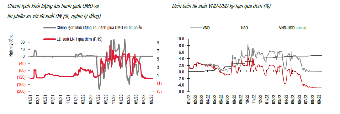 Tuần từ 11/09/2023-15/09, lãi suất liên ngân hàng kỳ hạn qua đêm dao động trong biên độ hẹp (0,15- 0,18%) và chênh lệch với lãi suất USD duy trì ở mức -500 điểm cơ bản. Áp lực về tỷ giá tiếp tục xuất hiện trong bối cảnh đồng USD mạnh lên toàn cầu.
