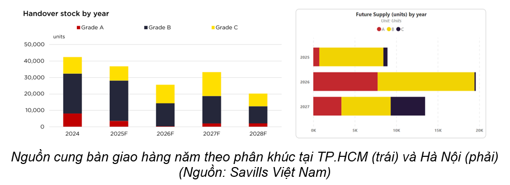 Một trong những xu hướng nổi bật của thị trường thời điểm này là sự áp đảo của phân khúc trung cấp, cụ thể là các sản phẩm thuộc nhóm Grade B và C. Đơn cử tại TP.HCM, hai phân khúc này chiếm tới 97% tổng nguồn cung căn hộ. Tại Hà Nội, phân khúc Grade B cũng giữ ưu thế tuyệt đối với 73% tổng nguồn cung sơ cấp. Điều này cho thấy các chủ đầu tư đang chủ động điều tiết nguồn hàng theo đúng năng lực chi trả của đại đa số người mua, đặc biệt là giới trẻ.