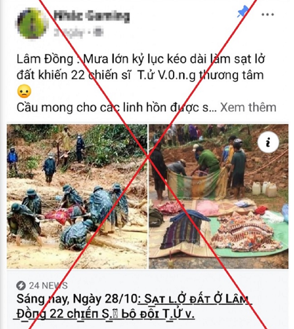Trước đó, trên mạng xã hội lan truyền bài viết có tựa đề “Sáng nay, ngày 28/10: sạt lở đất ở Lâm Đồng 22 chiến sĩ bộ đội tử vong” kèm theo một số hình ảnh tang thương về vụ lở đất trên.