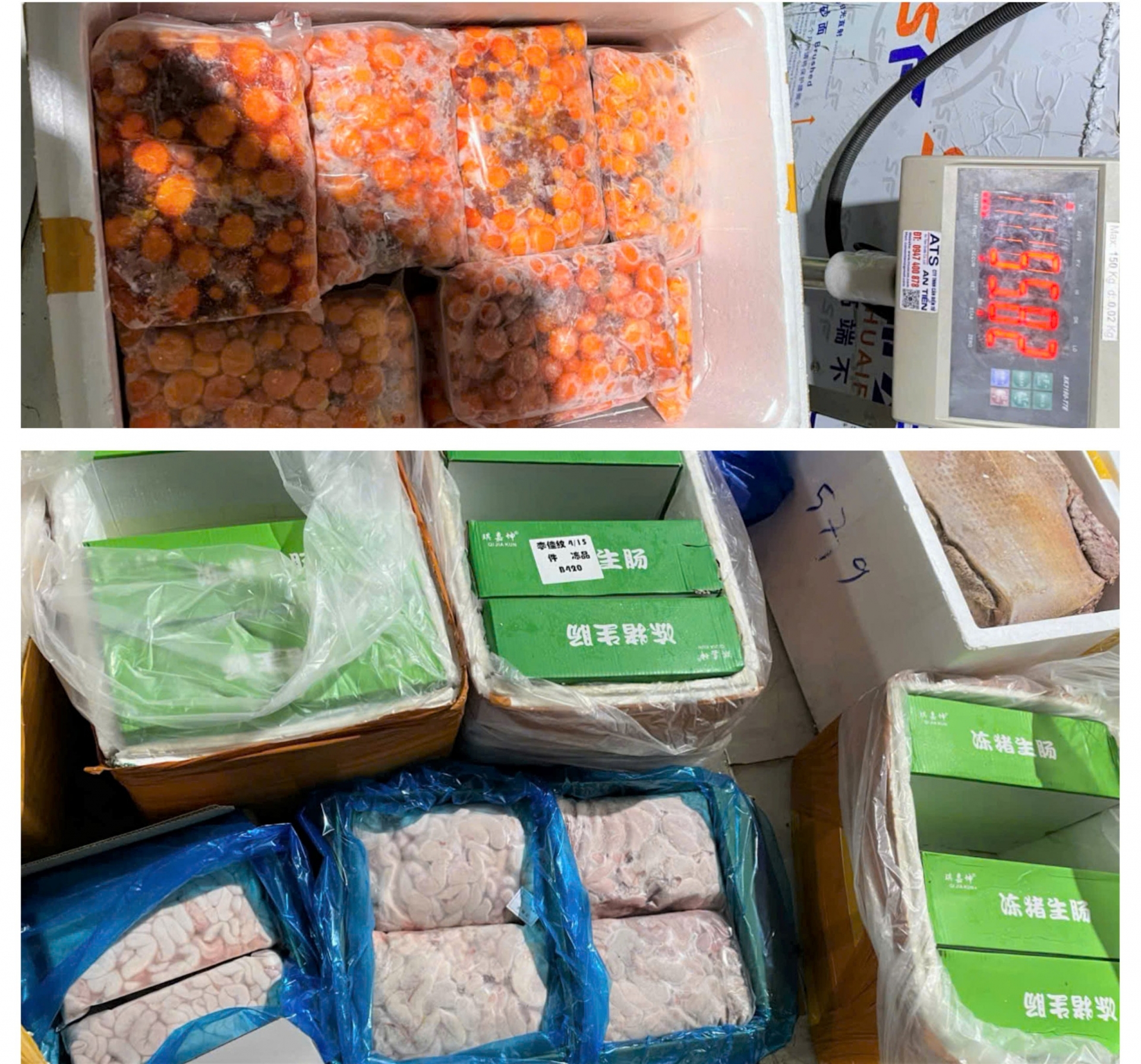 Qua kiểm tra, cơ quan công an phát hiện tại Công ty này đang tàng trữ 1.855 kg thực phẩm đông lạnh các loại như thịt trâu, gân trâu, bắp trâu, xương bò, thịt heo rừng đều không rõ nguồn gốc, xuất xứ.