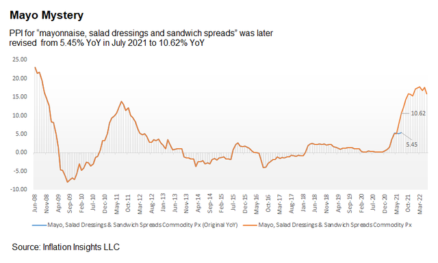 Khi xem xét 'lạm phát mayo' vào năm ngoái, các nhà phân tích của Bloomberg nhận thấy rằng CPI phản ánh mức tăng khoảng 5,8% so với cùng kỳ năm ngoái là tháng 7/2021. PPI cho thấy giá mayo đã tăng 5,4% trong cùng kỳ. Nhưng PPI sau đó đã được điều chỉnh tăng 10,6% - tức là gần gấp đôi so với báo cáo khi đó.
