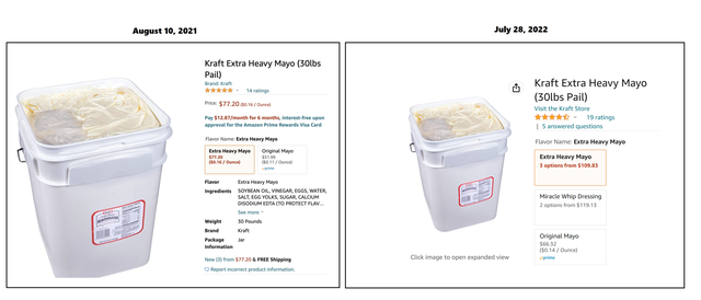 Một chai mayo cỡ đại của Kraft Heinz được bán với giá khoảng 77,20 USD trên Amazon vào khoảng 12 tháng trước, hiện có giá 109,83 USD và mức này chỉ áp dụng cho một số nhà cung cấp. Một thùng mayo cơ bản của Kraft Heinz đang có giá 66,32 USD, so với 51,99 USD vào năm ngoái, tức là tăng khoảng 27%.