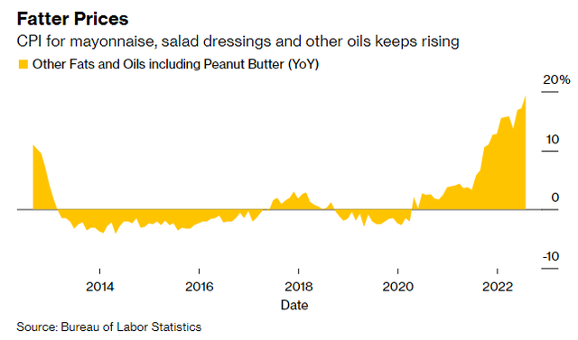 Theo dõi những số liệu này, các nhà phân tích của Bloomberg nhận thấy giá mayo đã tăng 5,4% so với cùng kỳ năm ngoái là tháng 7/2021. Tuy nhiên, nếu tra cứu cùng dữ liệu như vậy ở thời điểm hiện tại, bạn sẽ thấy một bức tranh rất khác. Hiện tại, mã hàng hóa trong PPI "xốt mayonnaise, nước xốt salad và phết bánh mì sandwich" đã tăng 10,6% trong cùng tháng này. Tức là, tỷ lệ lạm phát đã tăng gần gấp đôi.