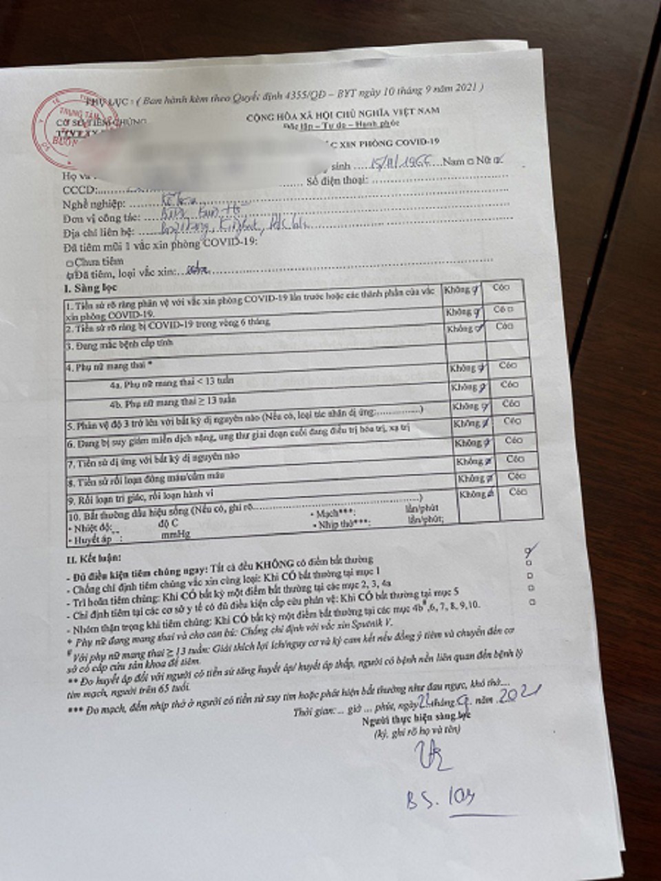 Phiếu khảo sát trước khi tiêm của bà N.T.V