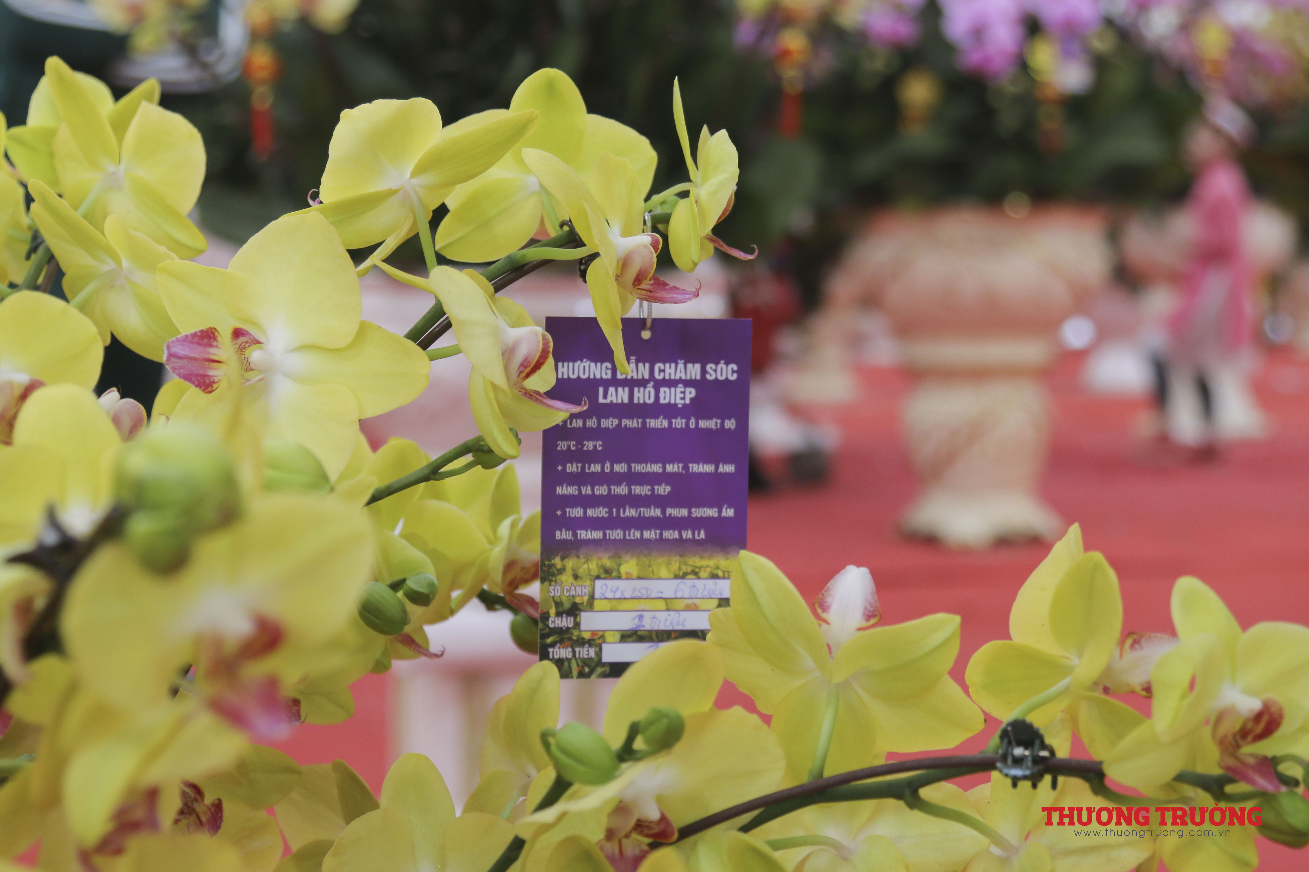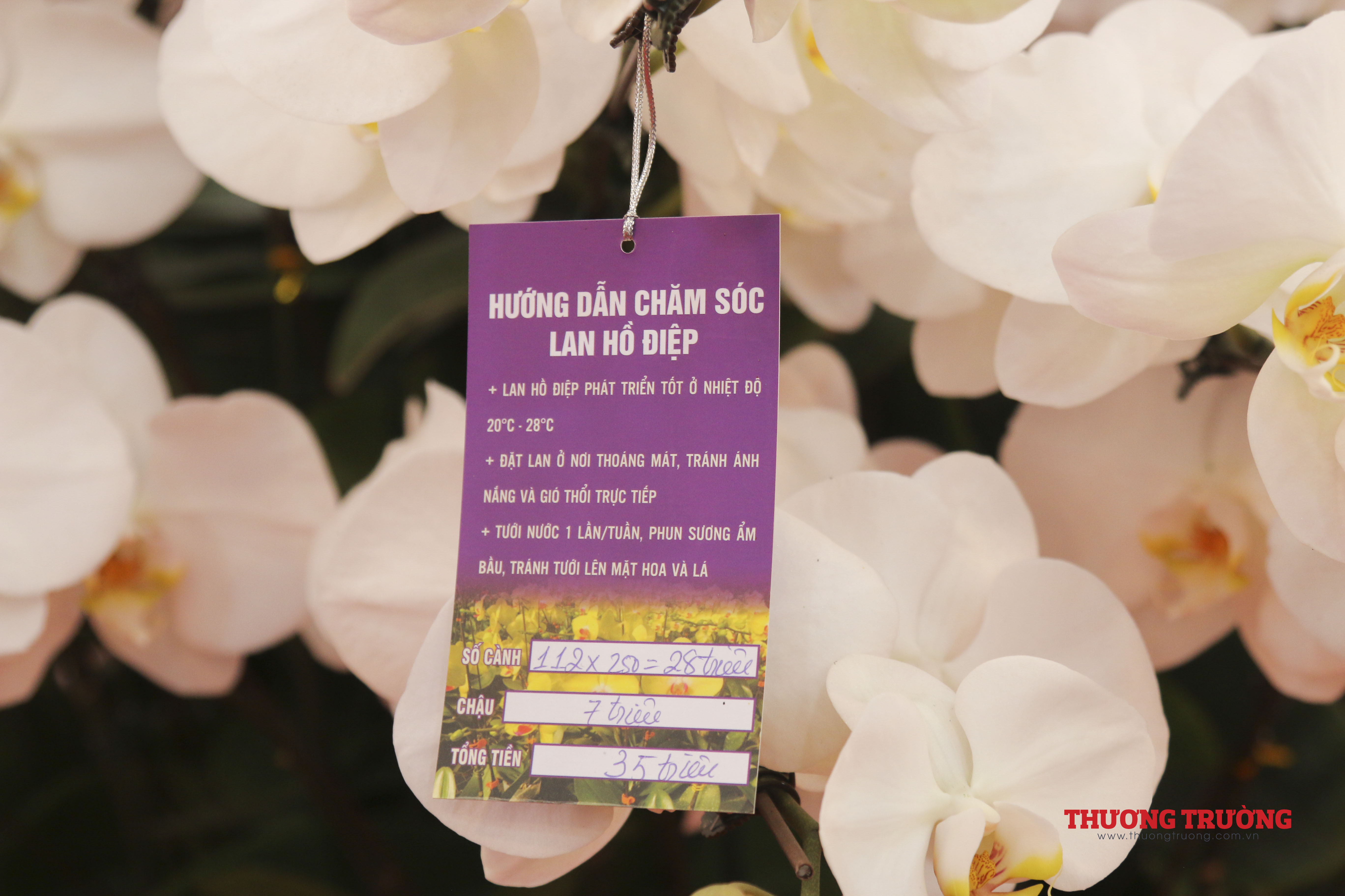 Trên mỗi chậu lan đề ghi rõ số lượng cành, giá và hướng dẫn cách chăm sóc hoa như thế nào. Đối với lan hồ điệp không cần tưới quá nhiều nước,chỉ cần 3-4 ngày thấy bề mặt đất khô là tưới nhẹ bằng bình xịt với lượng ẩm vừa đủ là được. Tránh tưới nước trực tiếp lên cánh hoa mà chỉ tưới dưới bề mặt gốc để đảm bảo hoa tươi được lâu và chơi được bền hơn.