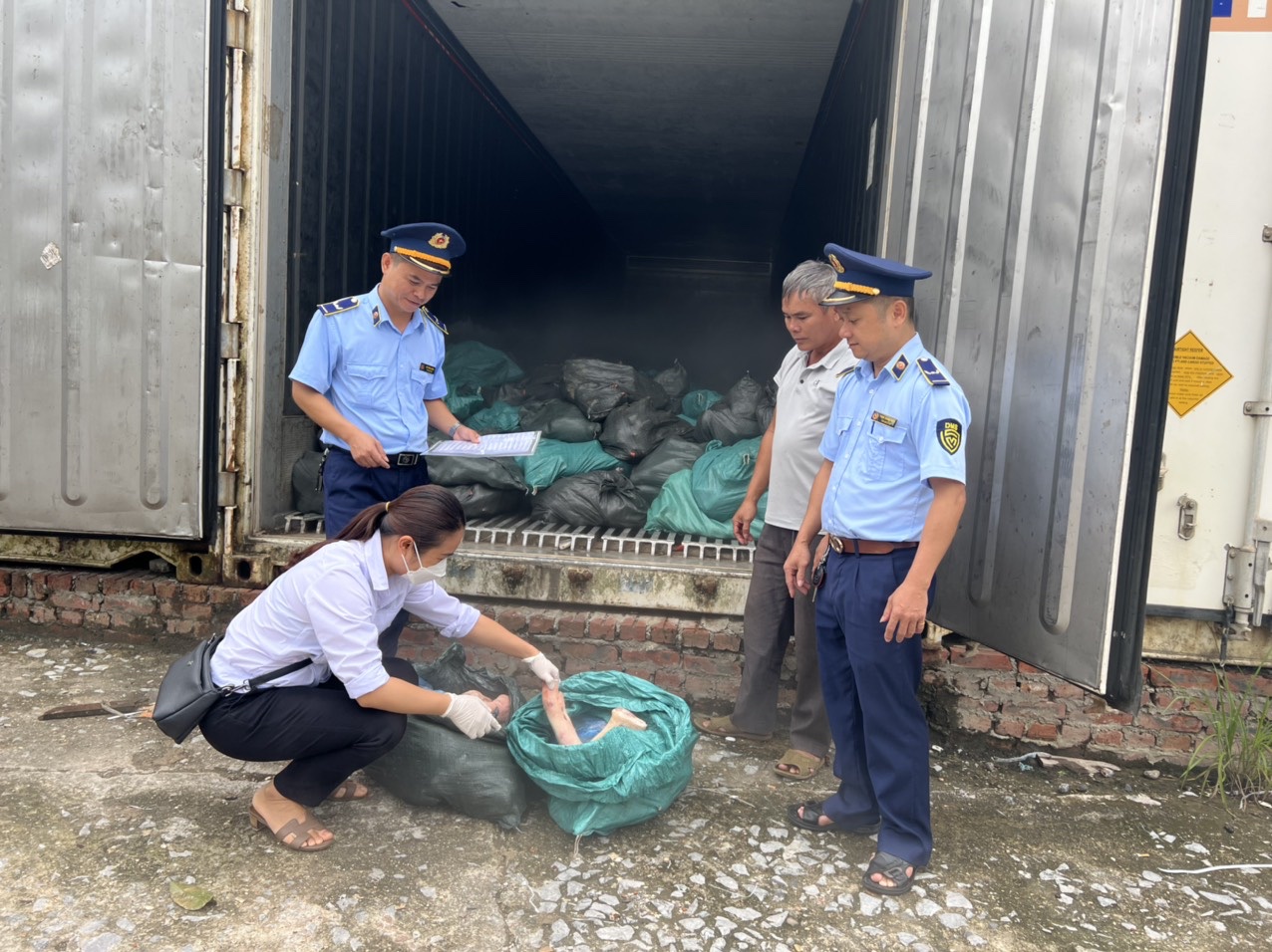 Tại thời điểm khám, phát hiện trong thùng kín của phương tiện này có cất giấu 75 bao tải bên trong chứa đựng hàng hóa là Móng giò lợn (loại cắt từ khuỷu chân tới móng) có tổng trọng lượng 1.500kg.
