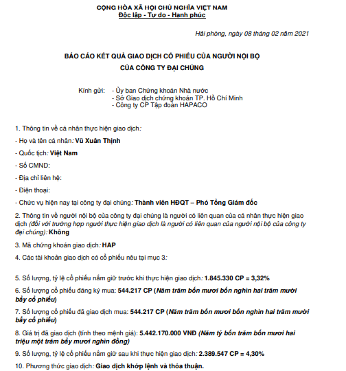 Sở Giao dịch Chứng khoán TP HCM cho biết, ông Vũ Xuân Thịnh thành viên HĐQT kiêm Phó tổng giám đốc tại CTCP Tập đoàn Hapaco (MCK: HAP - sàn HOSE) vừa mua vào 544.217 cổ phiếu HAP để nâng sở hữu tại công ty này.
