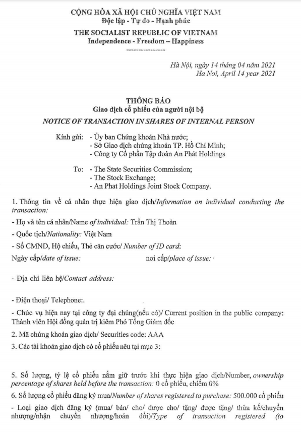 Bà Trần Thị Thoản, Thành viên HĐQT kiêm Phó tổng giám đốc tại CTCP Nhựa An Phát Xanh (MCK: AAA) đăng ký mua vào 500.000 cổ phiếu để nâng sở hữu tại doanh nghiệp.