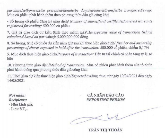 Nếu giao dịch thành công, bà Thoản sẽ nâng sở hữu từ 0% lên 0,17% vốn điều lệ của doanh nghiệp, giao dịch dự kiến thực hiện từ 19/4 đến 14/5.