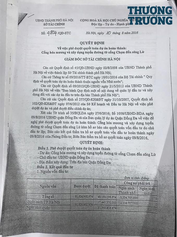 Tiếp đến, ngày 09/8/2016, UBND quận Đống Đa có Văn bản số 1058/UBND-BDA gửi Sở Tài chính đề nghị phê duyệt quyết toán vốn đầu tư hoàn thành cho Dự án.