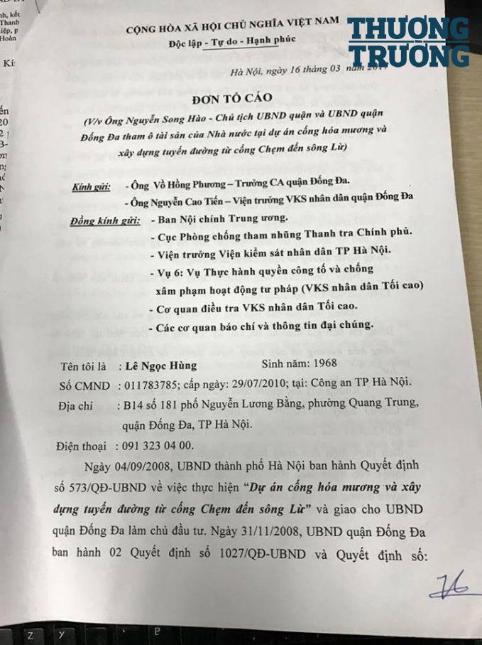 Đơn thư phản ánh của ông Lê Ngọc Hùng tố cáo ông Nguyễn Song Hào, Chủ tịch UBND quận Đống Đa và UBND quận Đống Đa tham ô tài sản của Nhà nước tại dự án cống hoa mương và xây dựng tuyến đường từ cống Chẹm đến sông Lừ.