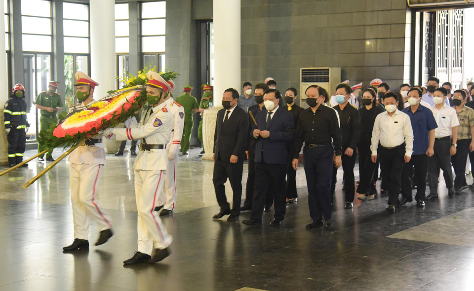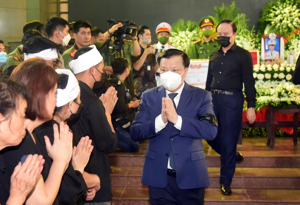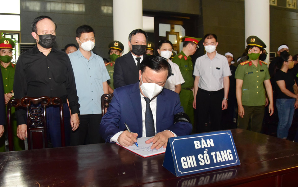 Xúc động tiễn biệt 3 cán bộ, chiến sĩ đã hy sinh thân mình vì nhiệm vụ, các đồng chí lãnh đạo thành phố và đoàn đã dành một phút mặc niệm. Thay mặt đoàn ghi sổ tang, Bí thư Thành ủy Hà Nội Đinh Tiến Dũng viết: “Vô cùng thương tiếc Liệt sĩ Đặng Anh Quân, Liệt sĩ Đỗ Đức Việt, Liệt sĩ Nguyễn Đình Phúc! Xin chia buồn sâu sắc cùng toàn thể gia quyến! Cầu chúc linh hồn các anh siêu thoát!”.