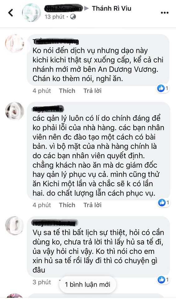 “Thật tình thì khi ăn nhà hàng mà gặp chuyện vầy thật không vui tí nào, huống chi là một chuỗi nhà hàng lớn như Kichi Kichi. Nhưng quản lý đã có lời xin lỗi, ngỏ ý đền bù thì mình cũng chấp nhận cho sự chân thành và sẽ xóa bài đăng cũ” – Khách hàng có tài khoản N.N chia sẻ trên FanFage “Thánh Rì Viu” Tuy vậy trên mạng vẫn còn vô số bình luận tỏ ra quan ngại cho thực khách đã từng và sắp chọn Kichi Kichi là nơi ăn uống cho mình và gia đình, bạn bè.