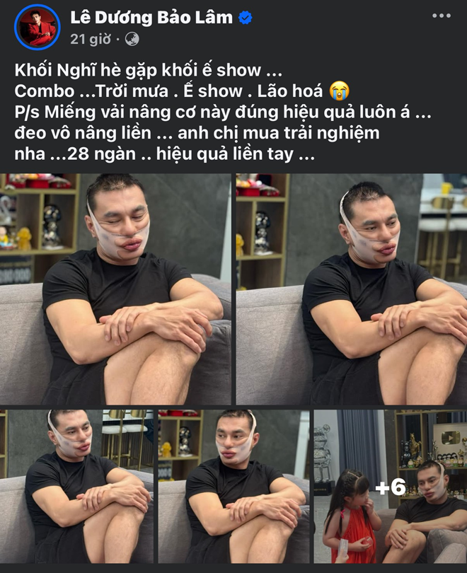 Trong một bài đăng mới nhất, Lê Dương Bảo Lâm hài hước nhưng không kém phần ngậm ngùi viết: "Khối nghỉ hè gặp khối ế show. Combo trời mưa - ế show - lão hoá.". Đi kèm đó là hình ảnh nam danh hài với khuôn mặt "biến dạng" cùng đôi môi "sưng vều".