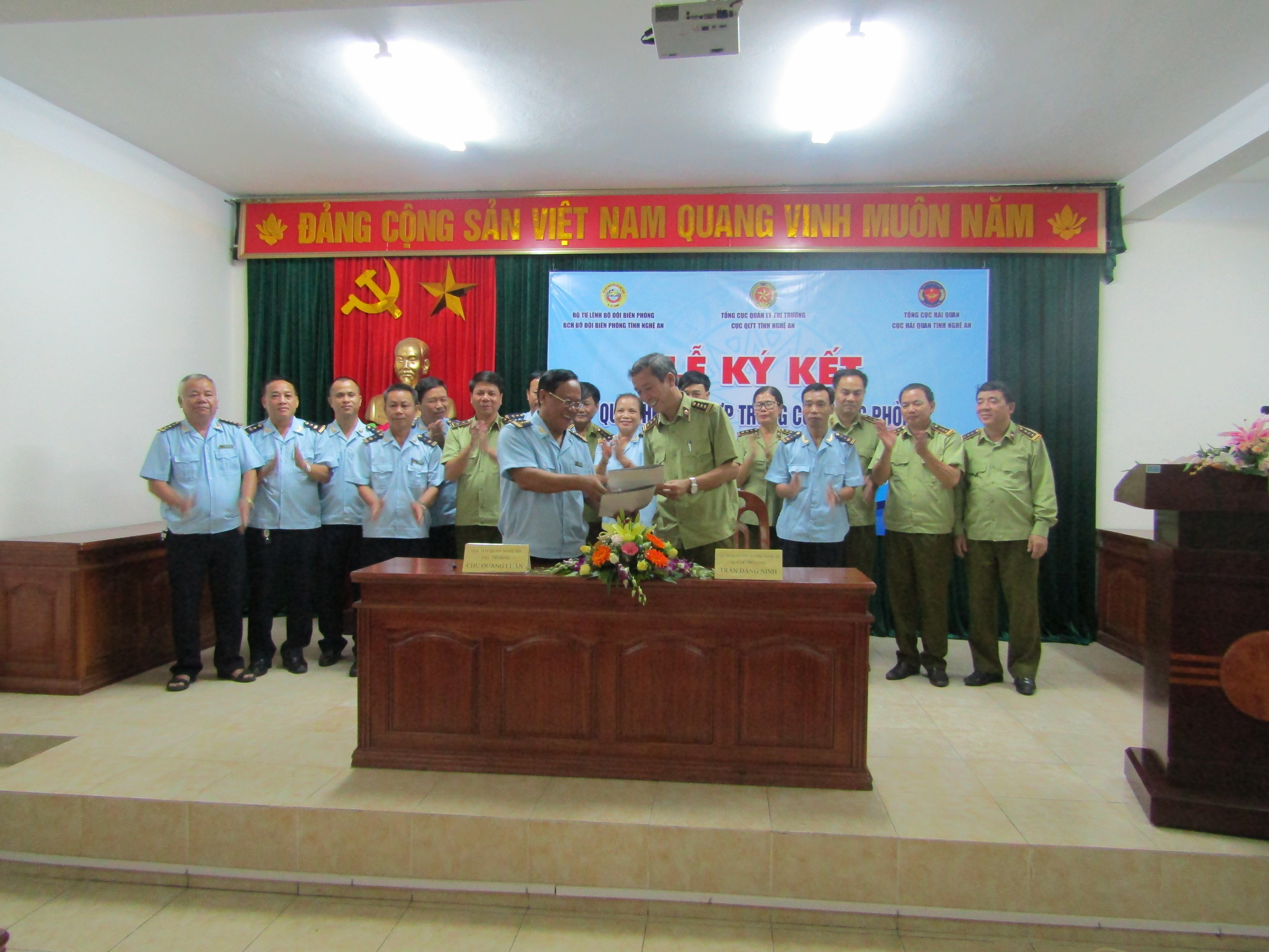 Tham dự buổi Lễ có đồng chí Trần Đăng Ninh – Bí thư Đảng ủy, Quyền Cục trưởng Cục Quản lý thị trường Nghệ An; đồng chí Chu Quang Luân– Bí thư Đảng ủy, Cục trưởng Cục Hải Quan Nghệ An; đồng chí Đại tá Trần Hải Bình – Chỉ huy trưởng Bộ chỉ huy BĐBP tỉnh Nghệ An và các cán bộ, chiến sỹ của các lực lượng cùng tham dự.