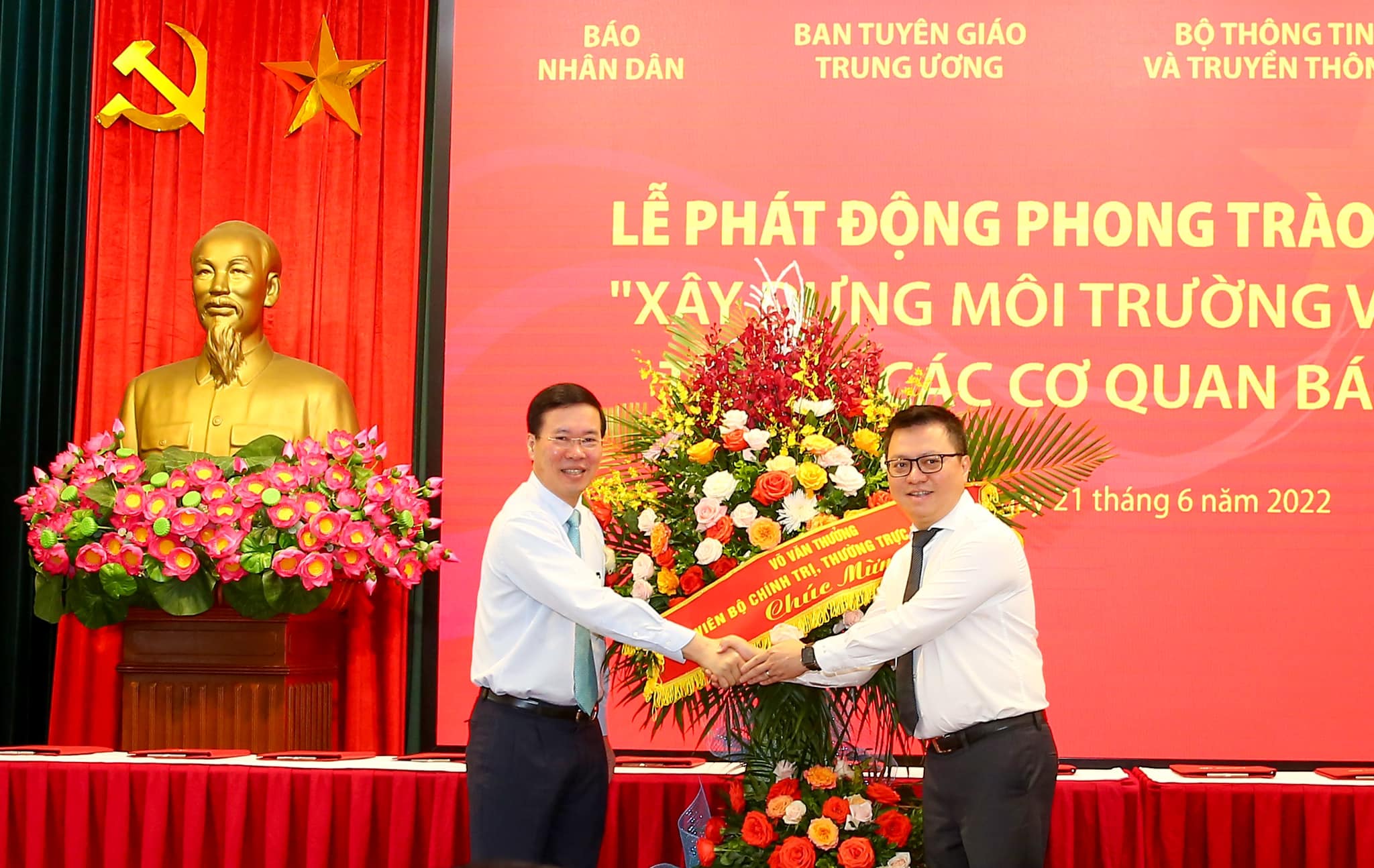 Nhân dịp kỷ niệm 97 năm Ngày Báo chí cách mạng Việt Nam, thay mặt lãnh đạo Đảng, Nhà nước, Thường trực Ban Bí thư Võ Văn Thưởng (ảnh trái) tặng hoa chúc mừng những người làm báo cả nước.