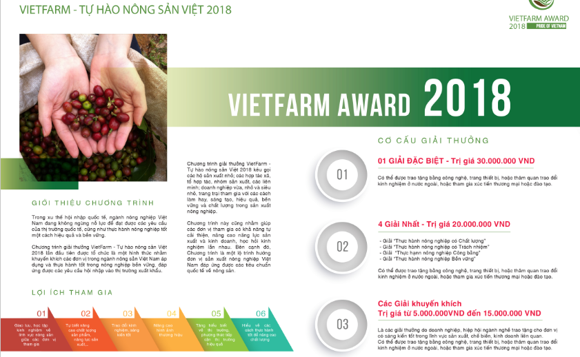Để nhận diện và tôn vinh các nỗ lực vì một nền nông nghiệp bền vững, Chương trình giải thưởng VietFarm – Tự hào Nông sản Việt được khởi động trong năm 2018. Ban tổ chức đã làm việc nghiêm túc từ khâu lọc hồ sơ đến khâu hướng dẫn tự đánh giá. Hơn 100 đơn vị và nông dân ở khắp các vùng miền đăng ký tham gia. Hội đồng chấm giải đã trực tiếp đi đánh giá thực địa tại 28 đơn vị lọt vào vòng chung kết.