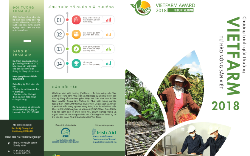 Ngày 23 tháng 12 năm 2018 tại Trung tâm Xúc tiến Thương mại Nông nghiệp - 489 Hoàng Quốc Việt, Trung tâm Phát triển và Hội nhập (CDI) phối hợp với Hiệp Hội Các nhà bán lẻ Việt Nam (AVR), Trung tâm Thông tin Phát triển Nông nghiệp Nông Thôn (AgroInfo), Viện Tư vấn Phát triển Kinh Tế xã Hội Nông Thôn và Miền Núi (CISDOMA) sẽ tổ chức Lễ Trao giải thưởng VietFarm – Tự hào Nông sản Việt 2018.