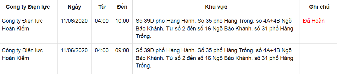 Lịch cắt điện khu vực Hoàn kiếm ngày 11/6.