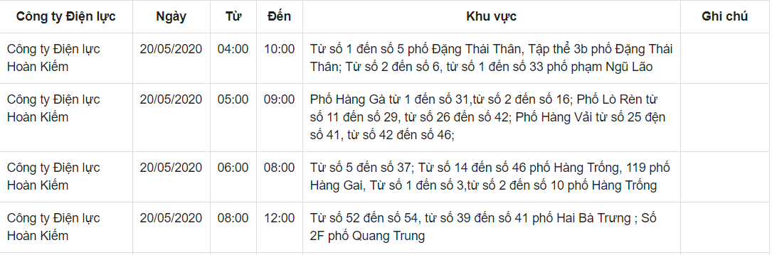 Theo Tổng Công ty Điện lực TP Hà Nội, các khu vực trên địa bàn quận Hoàn Kiếm sẽ bị cắt điện vào buổi sáng trong khoảng thời gian từ 04:00 - 12:00 sáng ngày 20/5.