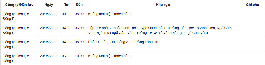 Theo Tổng Công ty Điện lực TP Hà Nội, các khu vực trên địa bàn quận Hoàn Kiếm sẽ bị cắt điện vào buổi sáng trong khoảng thời gian từ 04:00 - 12:00 sáng ngày hôm nay 20/5.
