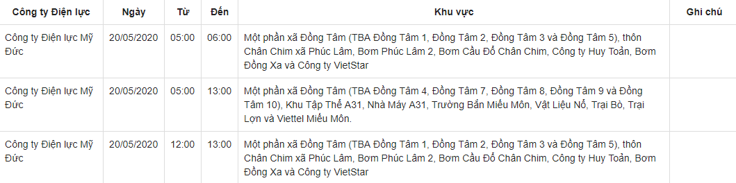 Lịch mất điện một số Quận, Huyện khácMột phần tổ dân phố Tháp - Phường Đại Mỗ - Quận Nam Từ Liêm, bị cắt điện từ 05:00 đến 13:00 giờ.